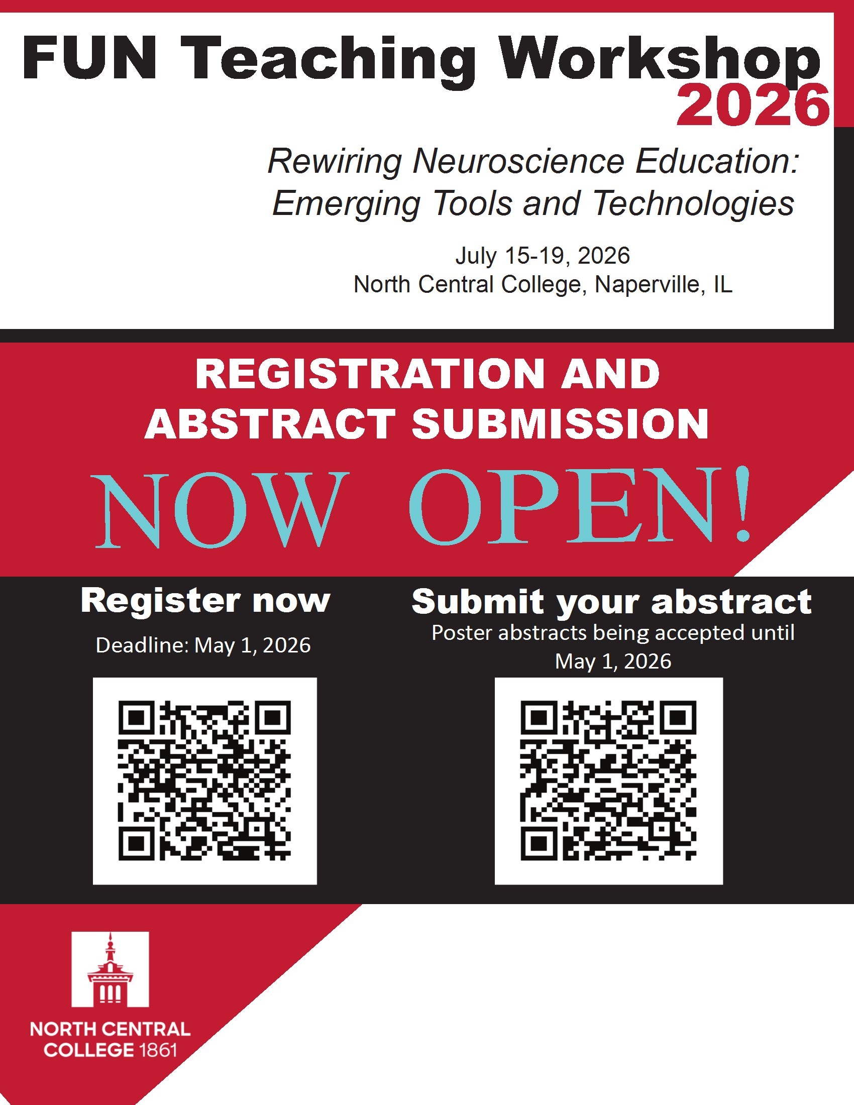 The Faculty for Undergraduate Neuroscience is a national organization that has been the leader in undergraduate neuroscience education since its founding over 30 years ago. This year’s neuroscience pedagogy workshop will take place from July 15-19 at North Central College in Naperville, IL and entitled Rewiring Neuroscience Education: Emerging Trends and Technologies. FUN pedagogical workshops are centered around designing, implementing, and assessing neuroscience programs in undergraduate settings. Sessions will include a broad array of ideas, approaches, and techniques, with keynotes focusing on ways colleagues are both leveraging and managing technology in the classroom, and spurring pedagogical innovation; ideas for translating our science, and the technology that fuels it. Work will be presented in the form of short teaching talks, pedagogy & lab workshops, posters, and themed mini-symposia. The deadline for poster submission is still open until May 1, 2026.