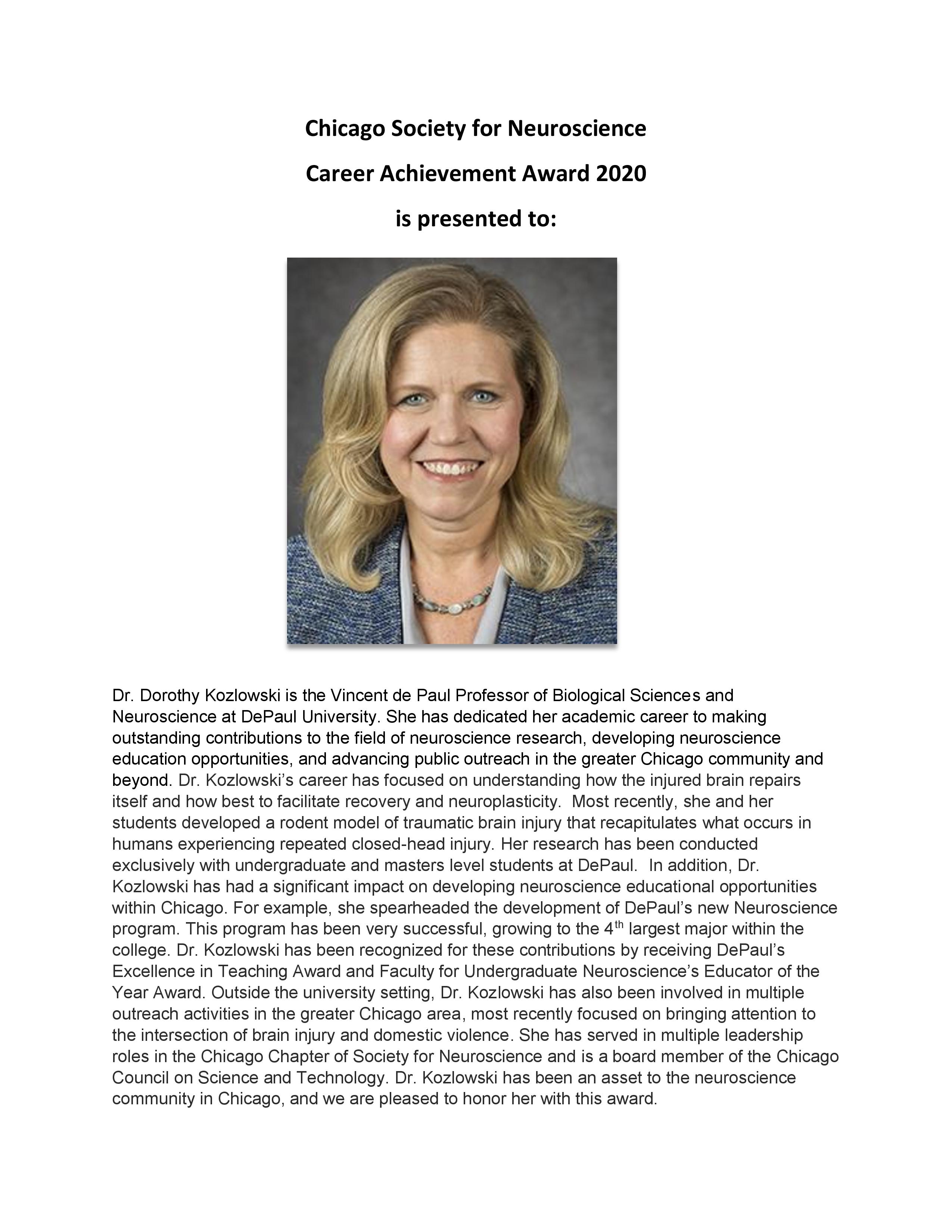 The Chicago Chapter of the Society for Neuroscience is pleased to announce an annual award to recognize chapter members who in their careers have made outstanding contributions to advance neuroscience education, research and/or outreach in the greater Chicago Community. This award is based on nominations and announced at the Chicago Society for Neuroscience Annual Meeting. One award is presented annually.